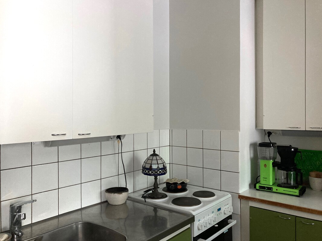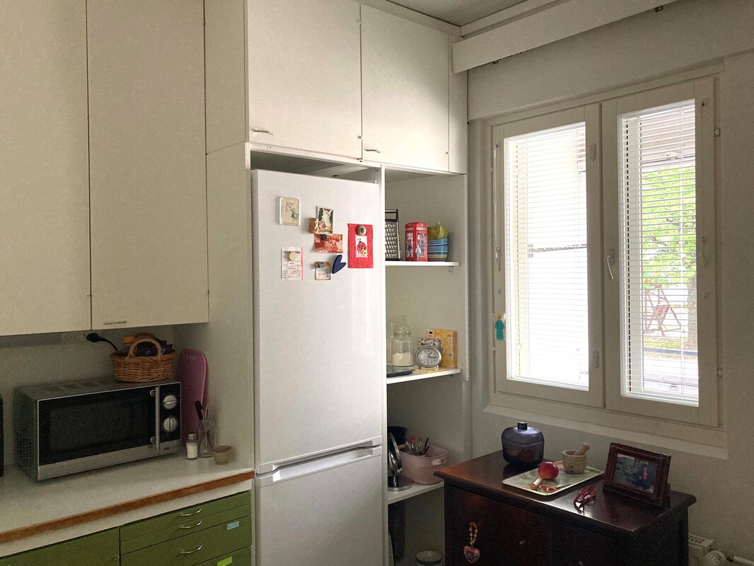 Keittiön varustelu | Tilava, peruskuntoinen keittokomero, jonne mahtuu pieni ruokapöytä. Varusteena sähköliesi, jää-/pakastinkaappi. Maalatut seinät, välitila laatoitettu, lattiassa siisti muovimatto. |