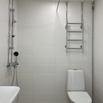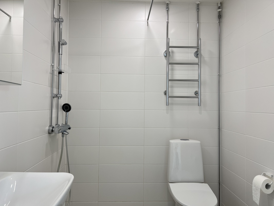 | Kylpyhuoneen kuvaus | Kylpyhuone on laatoitettu. Varusteet: Pesukoneliitäntä, lattialämmitys, peilikaappi, pesuallas, allaskaappi, vesikiertoinen kuivauspatteri, suihku, wc-istuin. |