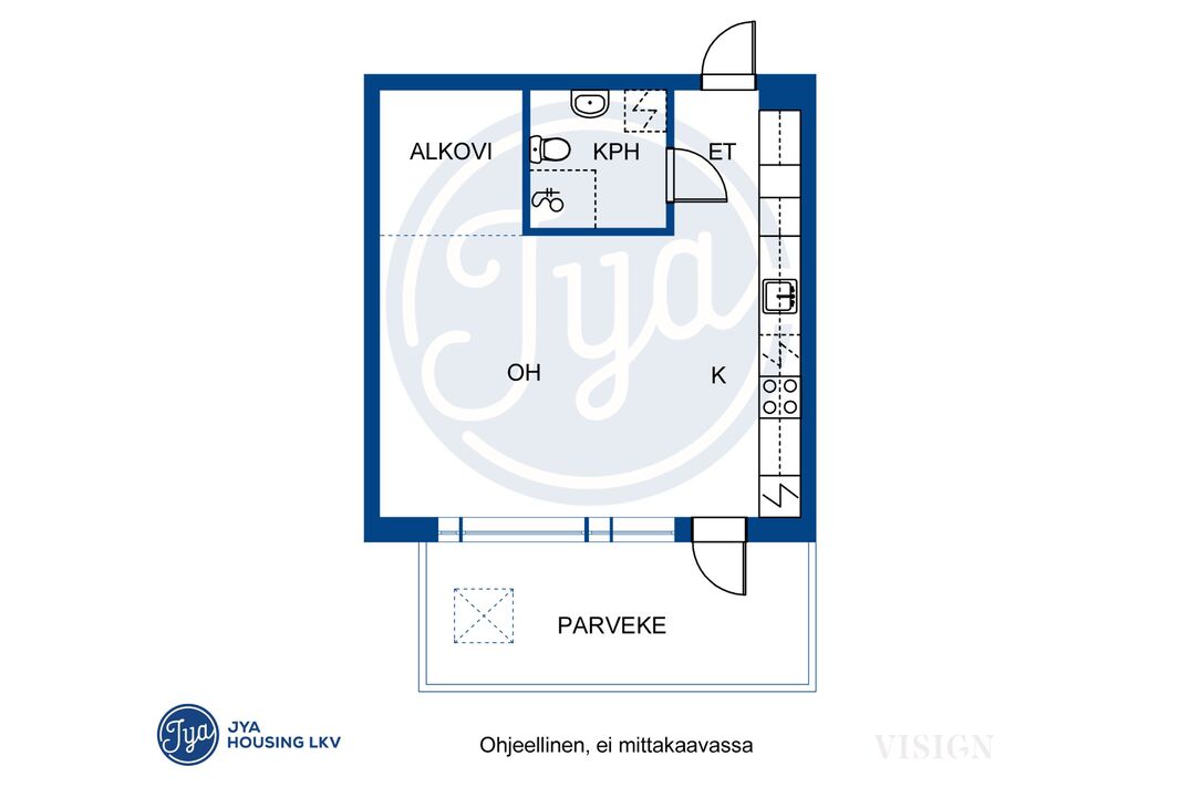 | Huoneistoselitelmä | 1h, avokeittiö, kph, lasitettu parveke (yj. 1h+k+alk.) |