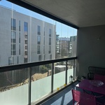 Valoisa vaalea koti, jossa on suuri lasitettu terassi rauhalliselle sisäpihalle.