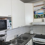 | Keittiön varustelu | Keittiöön mahtuu pieni myös ruokapöytä. |