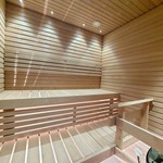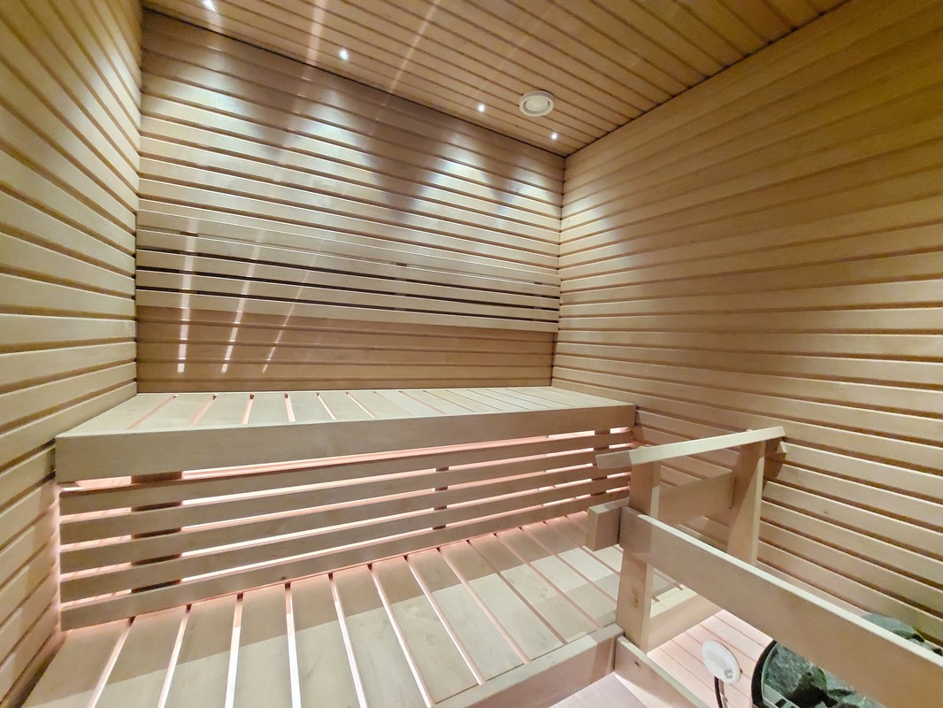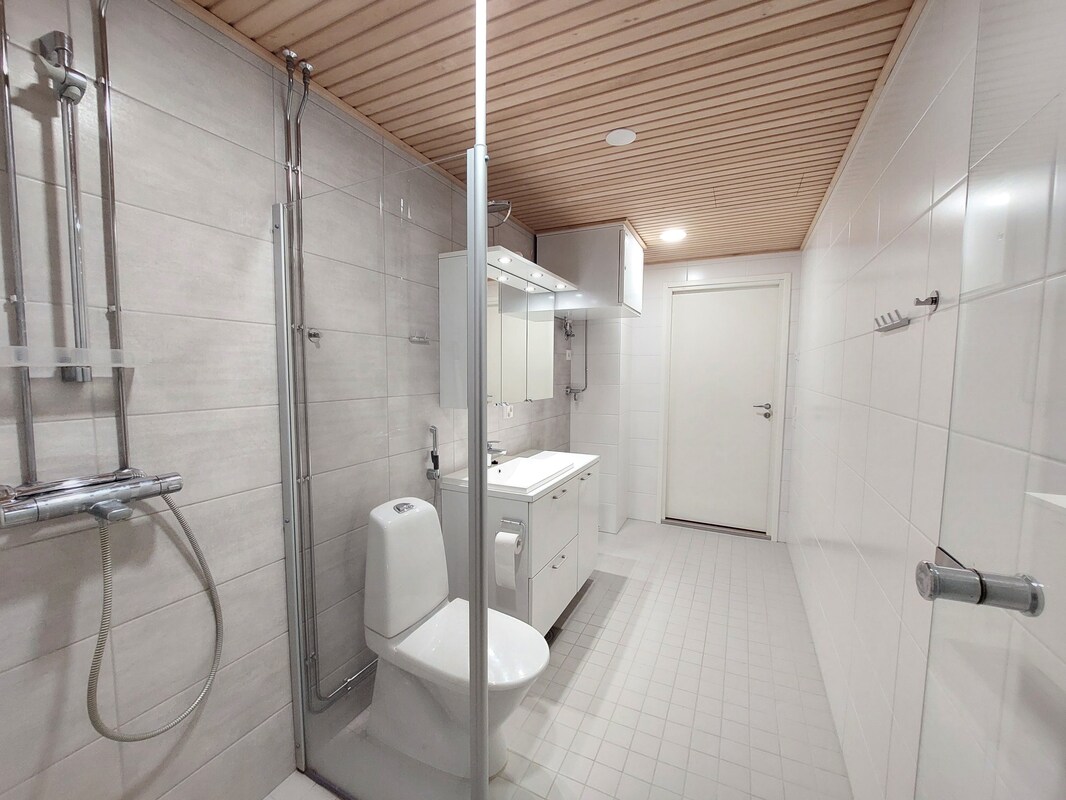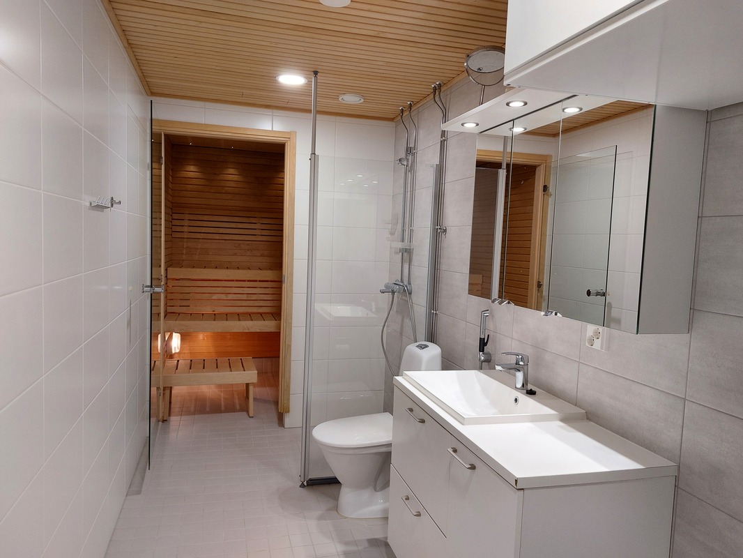Tilava kaakeloitu kylpyhuone ja oma sauna.
