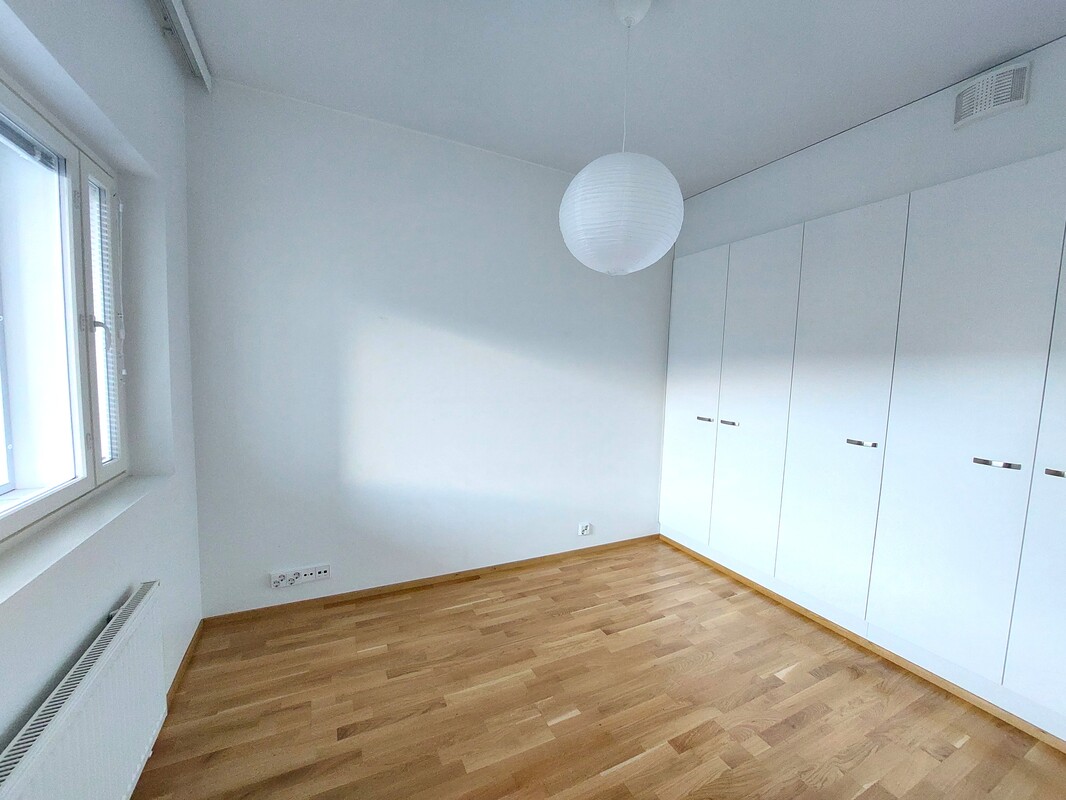 | Makuuhuoneen kuvaus | Valoisa makuuhuone, jossa runsaasti kaapistoja. Lattia lauta-parkettia ja seinät maalattu. |