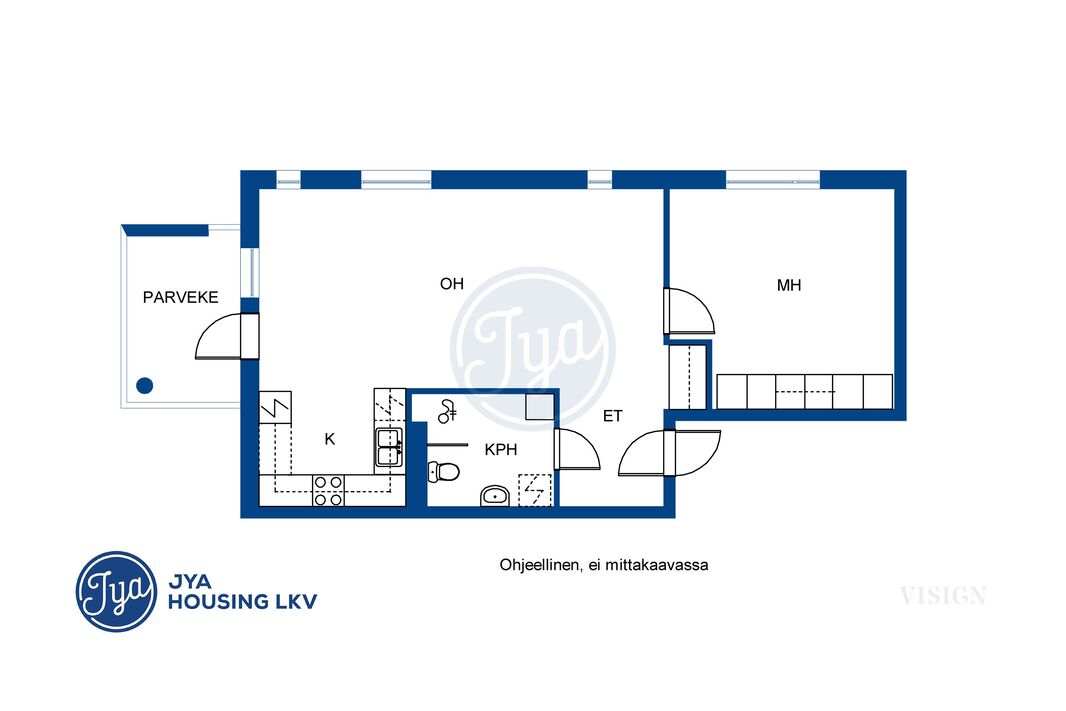 | Huoneistoselitelmä | 2h, avokeittiö, kph, lasitettu parveke (yj 2h+kt) |