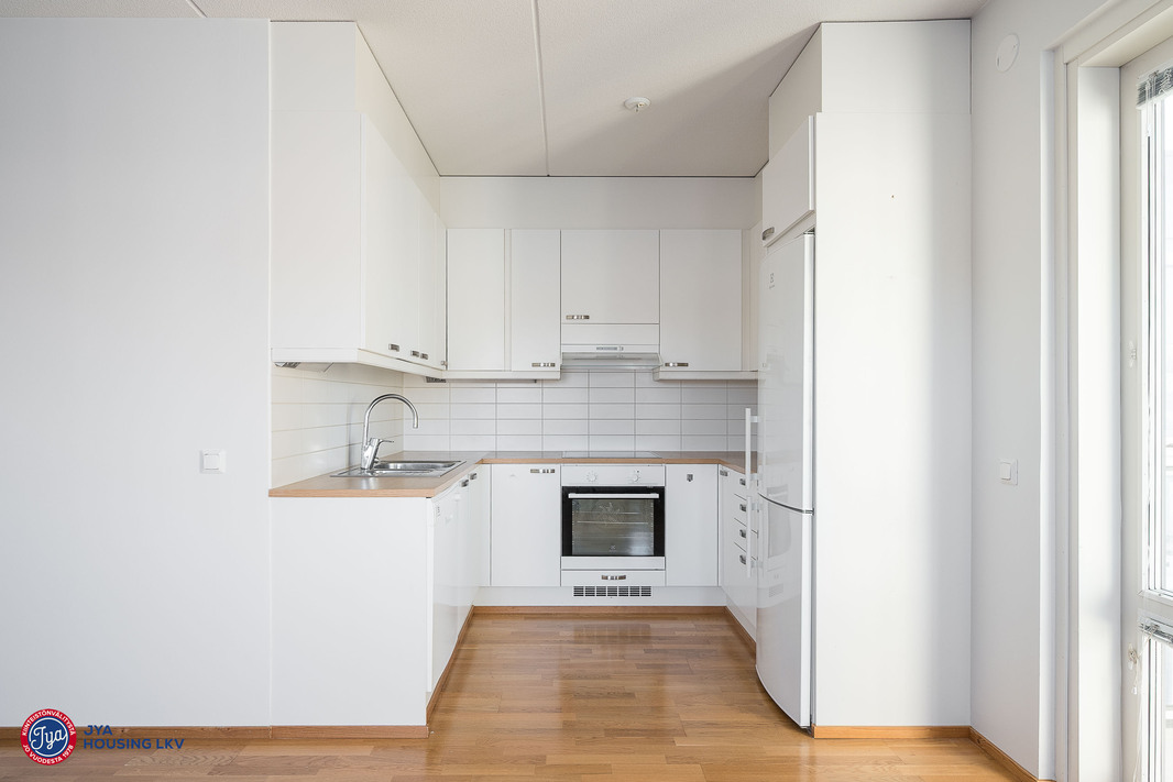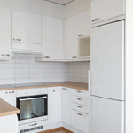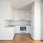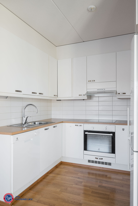 | Keittiön varustelu | Olohuoneeseen yhdistyvässä keittiössä jääpakastinkaappi, astianpesukone, kalusteuuni, keraaminen liesitaso, liesituuletin, kiinteät valaisimet, kaapistot/laatikostot. Tasot laminaattia, välitilat laatoitettu, parkettilattia. |