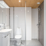 | Kylpyhuoneen kuvaus | Suihku ja suihkuseinä, kaappi, allas- ja peilikaappi, kuivauspatteri, pesukoneliitäntä, wc-istuin, bidee-suihku, lattialämmitys (sähköinen, kytketty asunnon sähkönmittaukseen). Lattia ja seinäpinnat laatoitettu, katto paneloitu. |
