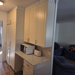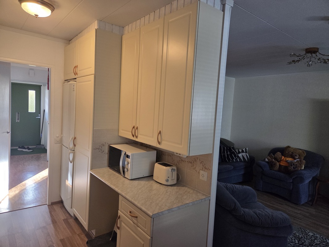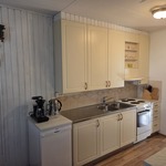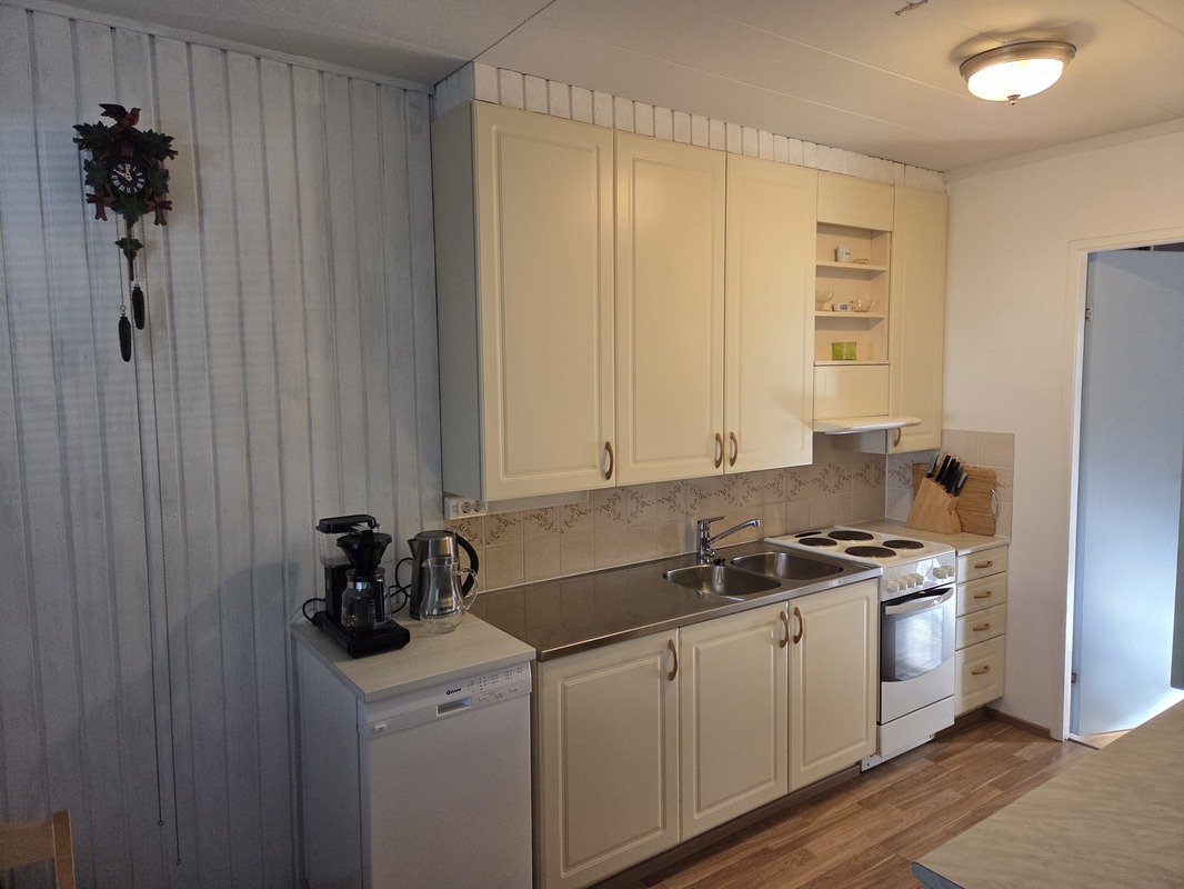 Keittiön varustelu | Liesi, astianpesukone, kaapistot,lattia:laminaatti, Seintä: maalattu |