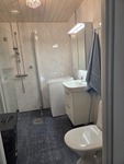 Kylpyhuoneen kuvaus | Wc-istuin, allaskaappi, peilikaappi, rättipatteri, erill.kaappi, Seinät ja lattia laattaa |