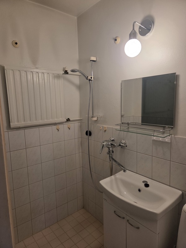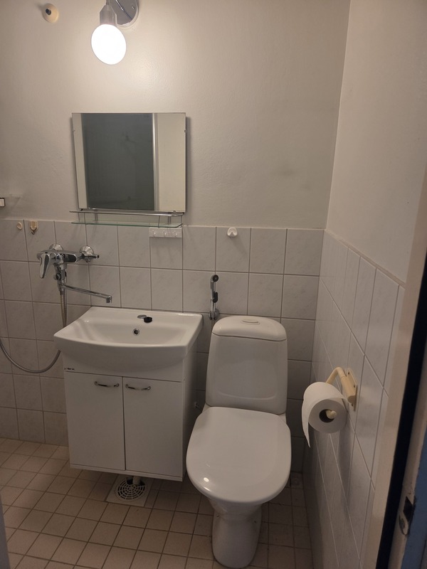 | Kylpyhuoneen kuvaus | Allaskaappi, käsienpesu-allas, pk-liitäntä, suihkuseinä taitettava, wc-istuin, peili. Lattia : laatta, seinät puoliksi laatoitettu. |