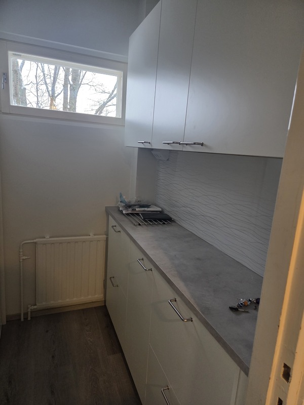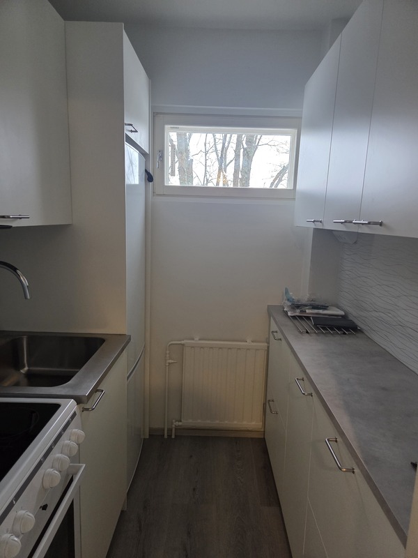 | Keittiön varustelu | Uusi juuri saneerattu keittokomero. Kaikki kaapistot, työtasot, välitilat, kodinkoneet esim keraaminen liesi, liesituuletin, astianpesukone ,jääkaappi/pakastin ovat käyttämättömiä. Lattia laminaatti ja keittokomerossa on ikkuna. |