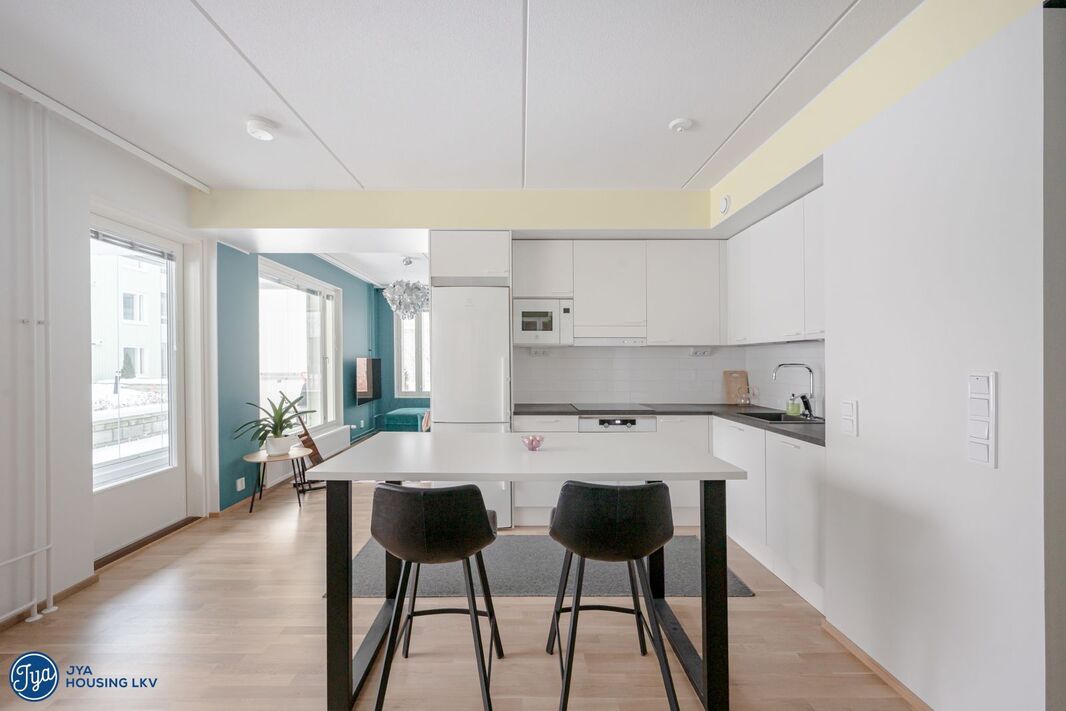 Asunnossa on toimivan avokeittiön yhteydessä tila, joka sopii niin olohuoneeksi kuin ruokailuun. Kivana lisänä erilaisille toiminnoille on myös ikkunallinen alkovi; vaikka työtilaksi tai TV-huoneeksi. Makuuhuone on näppärän kokoinen kaapistoineen. Kylpyhuone on tilava ja toimiva.