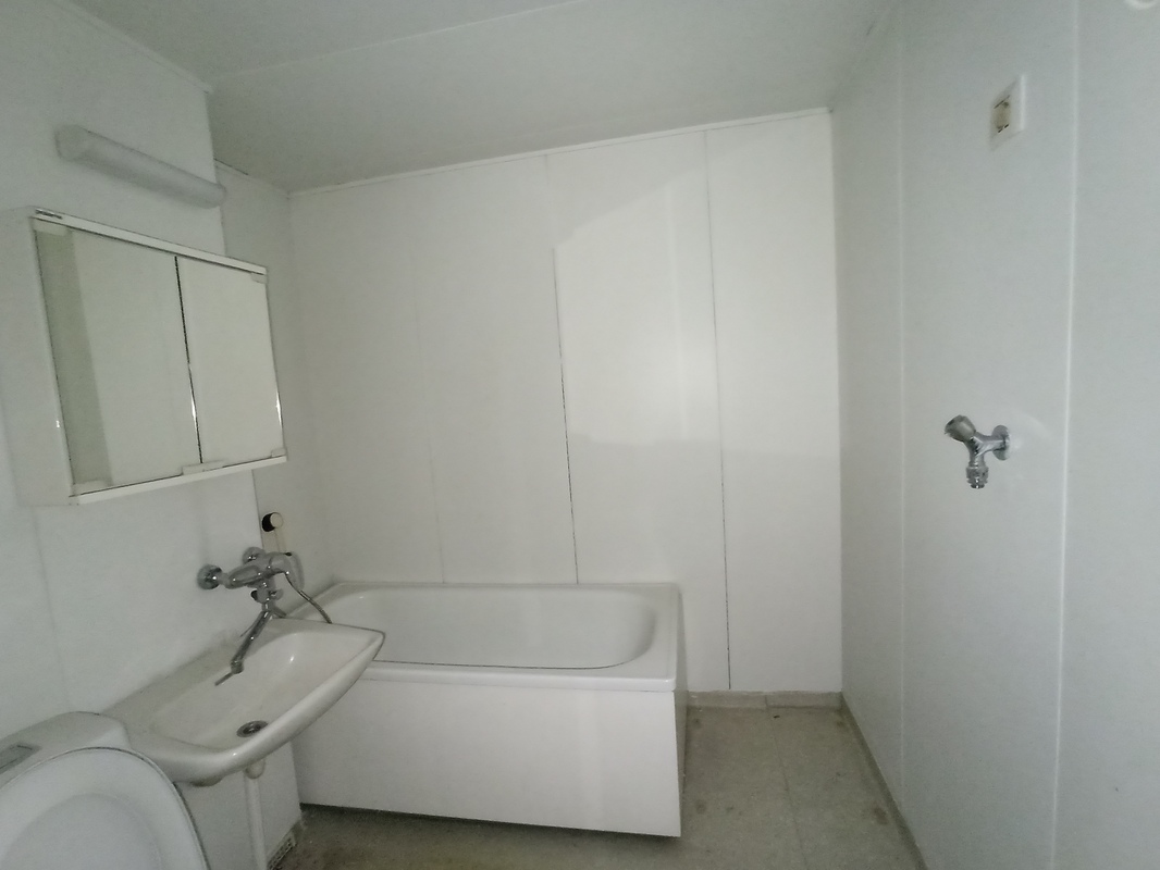 | Kylpyhuoneen kuvaus | Lattia muovimatto, seinät maalattu, WC istuin, pesuallas ja hana, amme. |