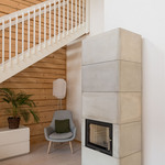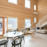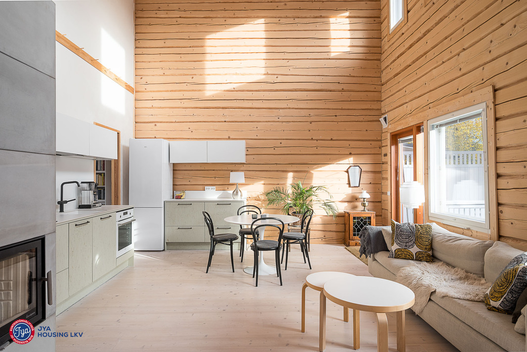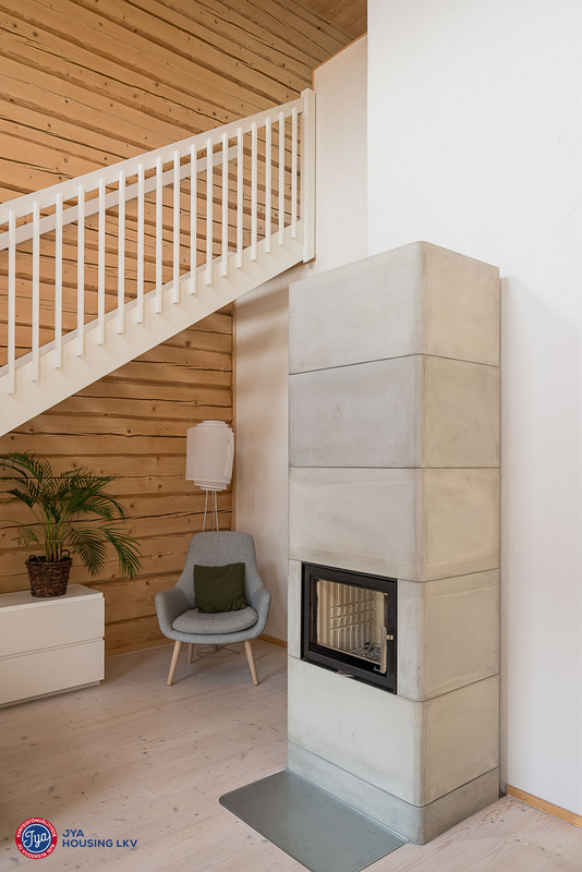 Olohuone / avokeittiön huonekorkeus noin 6 m                         Varaava takka
