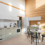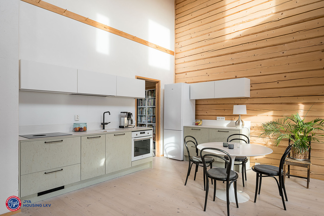 | Keittiön varustelu | Avokeittiössä Puustellin Miinus-keittiö, keraamiset tasot, induktioliesitaso liesituulettimella (Bora), kalusteuuni (AEG SteamBake-höyryuuni), integroitu astianpesukone (AEG), jääkaappi-pakastin yhdistelmä (AEG). Hormivaraus erilliselle liesituulettimelle. |