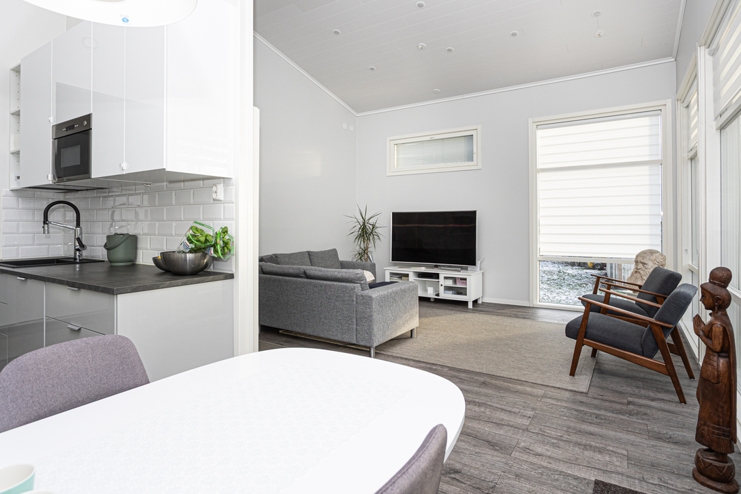 Koti on vaalea, moderni ja muuttovalmis ilman remonttitarpeita. Koulu sijaitsee aivan vieressä, mikä tekee arjesta sujuvaa lapsiperheelle. Taloyhtiön ulkosaunarakennus on viimeistelyä vaille valmis ja tuo lisää yhteisiä mahdollisuuksia asumisviihtyvyyteen.