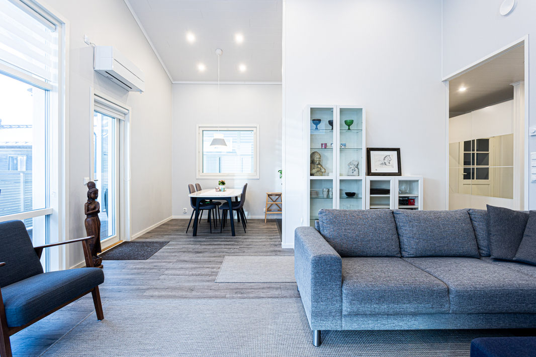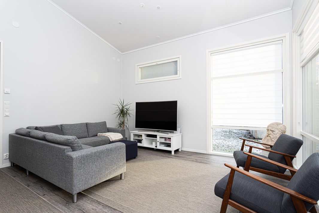 Laaja, n. 50 m² katettu terassi kiertää lähes talon ympäri – tarjoaa runsaasti tilaa oleskeluun ja ympärivuotiseen käyttöön. Kodin sydän on avara keittiö–ruokailutila–olohuone, jonka n. 4 m harjakorkeus lisää tilantuntua ja valoa olohuoneessa.