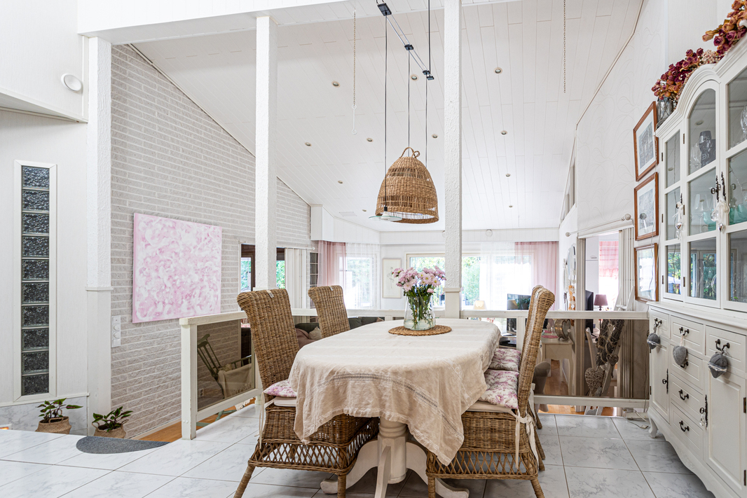Tämä porrastettu 1-tasoinen koti hurmaa harmonisella tunnelmallaan ja toimivalla pohjaratkaisullaan. Avoin keittiö yhdistyy ruokailutilaan ja olohuoneeseen, jossa viisto sisäkatto tuo tilaan avaruutta ja valoa.