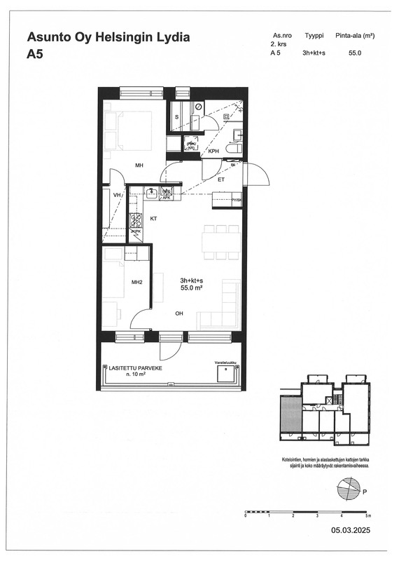 3h, avokeittiö, vh, s, kph, lasitettu parveke