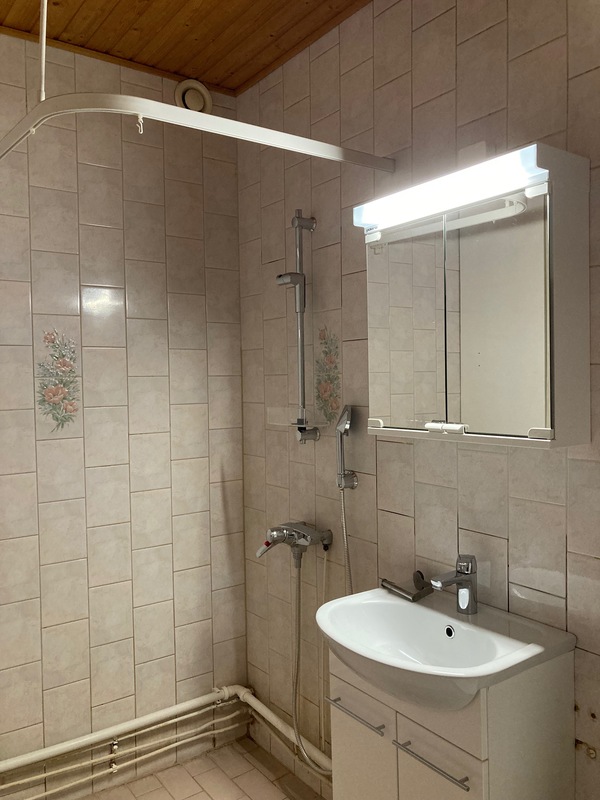 Kylpyhuoneen kuvaus | Laatoitetussa kylpyhuoneessa on uusittu suihku, wc-istuin, peilikaappi sekä lavuaari. Pyykkikaappi sekä pk-liittymä löytyy täältä myös. |