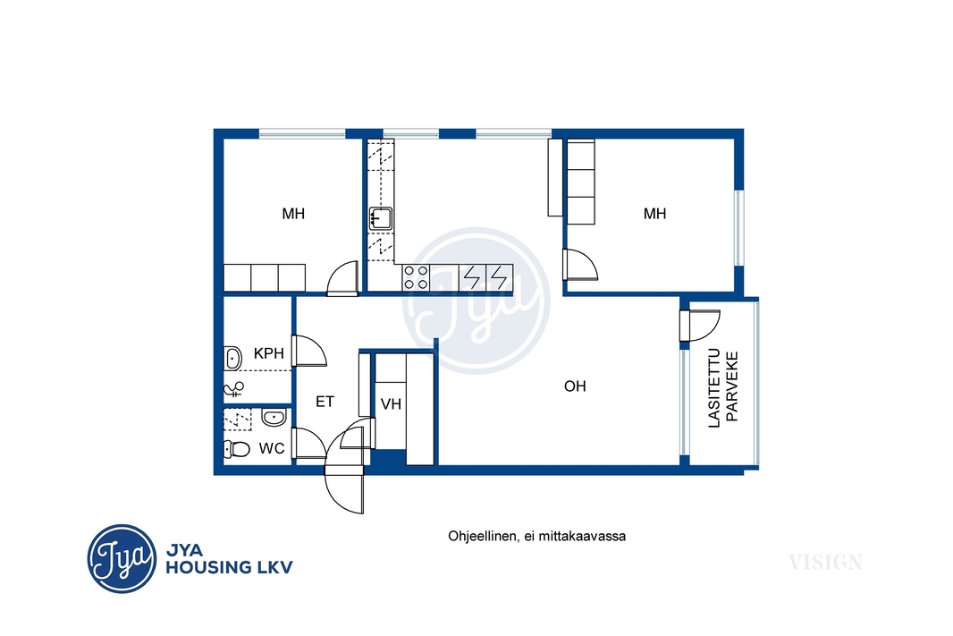 | Huoneistoselitelmä | 3h, k, kph, wc, vh, lasitettu parveke |