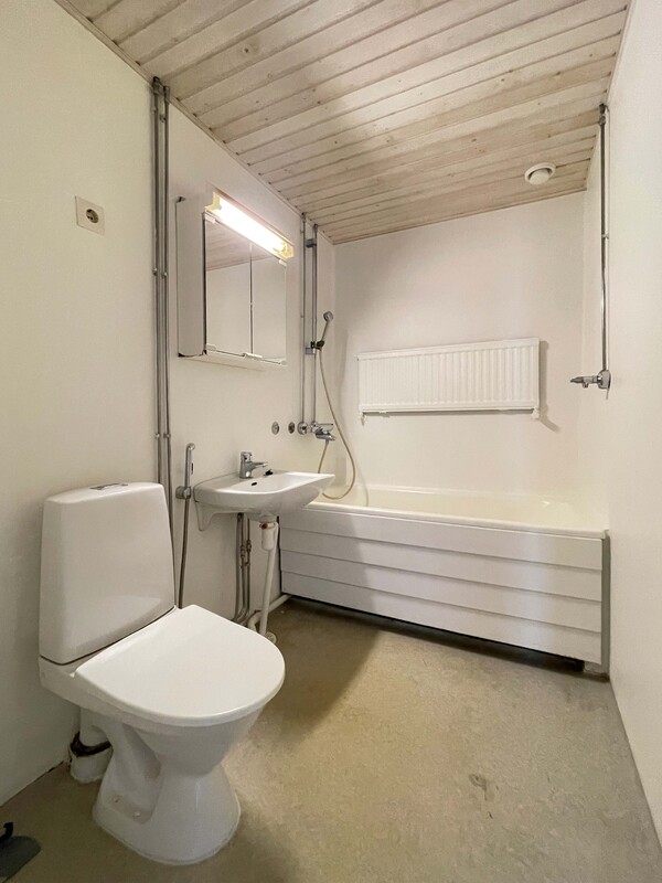 Kylpyhuoneen kuvaus | Kylpyhuone: // Lattia: muovimatto // Seinät: betoni // Katto: paneeli Varusteet: - peilikaappi - lavuaari - bideesuihku - pyykinpesukoneliitäntä - viemäri - wc-istuin |