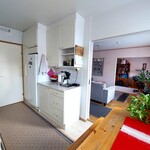 | Keittiön varustelu | Vaaleat kaapistot, liesi, liesituuletin ja pystyjääkaappi. Seinät maalattu, välitila laatoitettu ja lattia muovimattoa. |