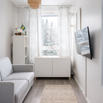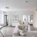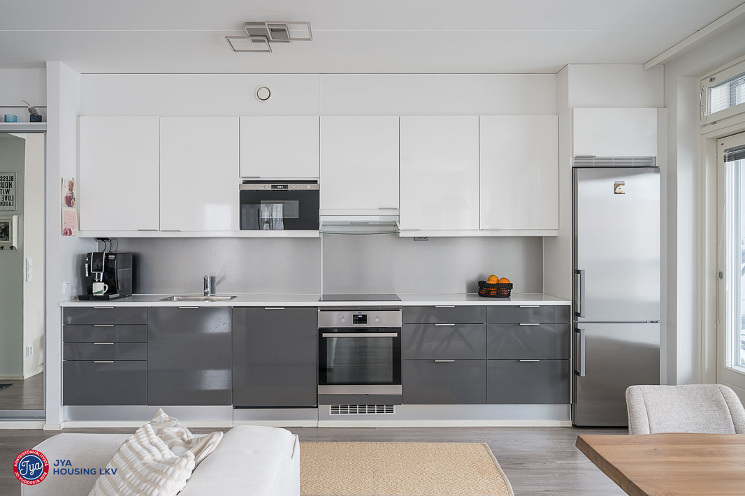 | Keittiön varustelu | Avokeittiössä induktioliesitaso, kalusteuuni, liesituuletin, integroitu mikroaaltouuni, jääpakastinkaappi, kaapistot, välitila levytetty. |