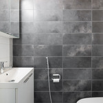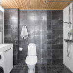 | Kylpyhuoneen kuvaus | Kylpyhuoneessa suihku ja suihkuseinä, peili- ja allaskaappi, wc-istuin, bidee-suihku, tila pesutornille. Lattia ja seinäpinnat laatoitettu, katto paneloitu. |