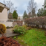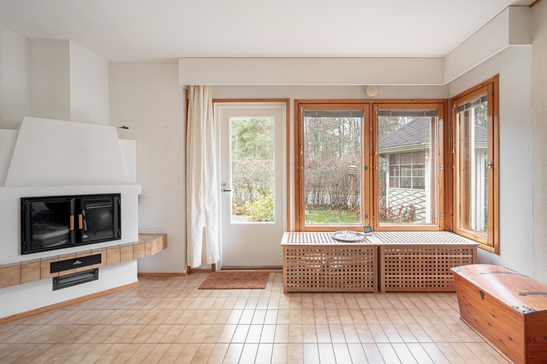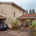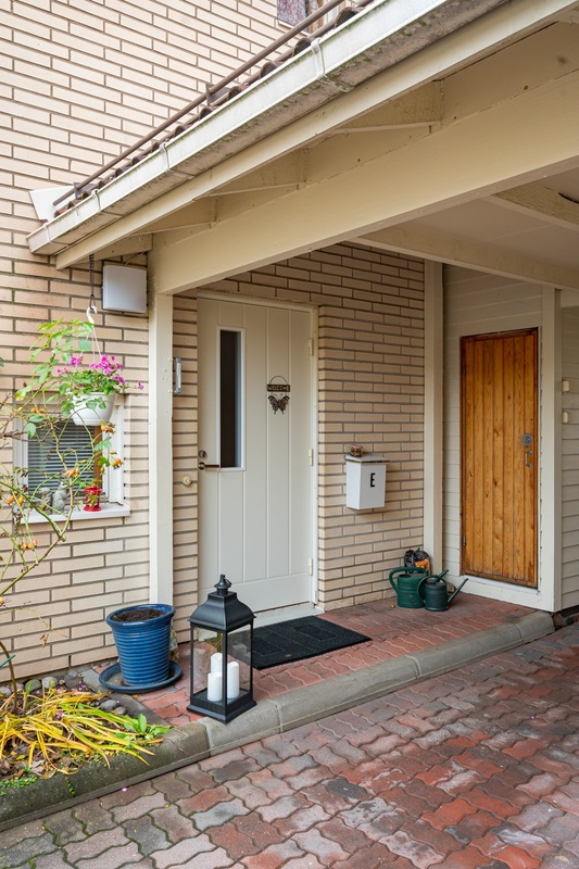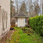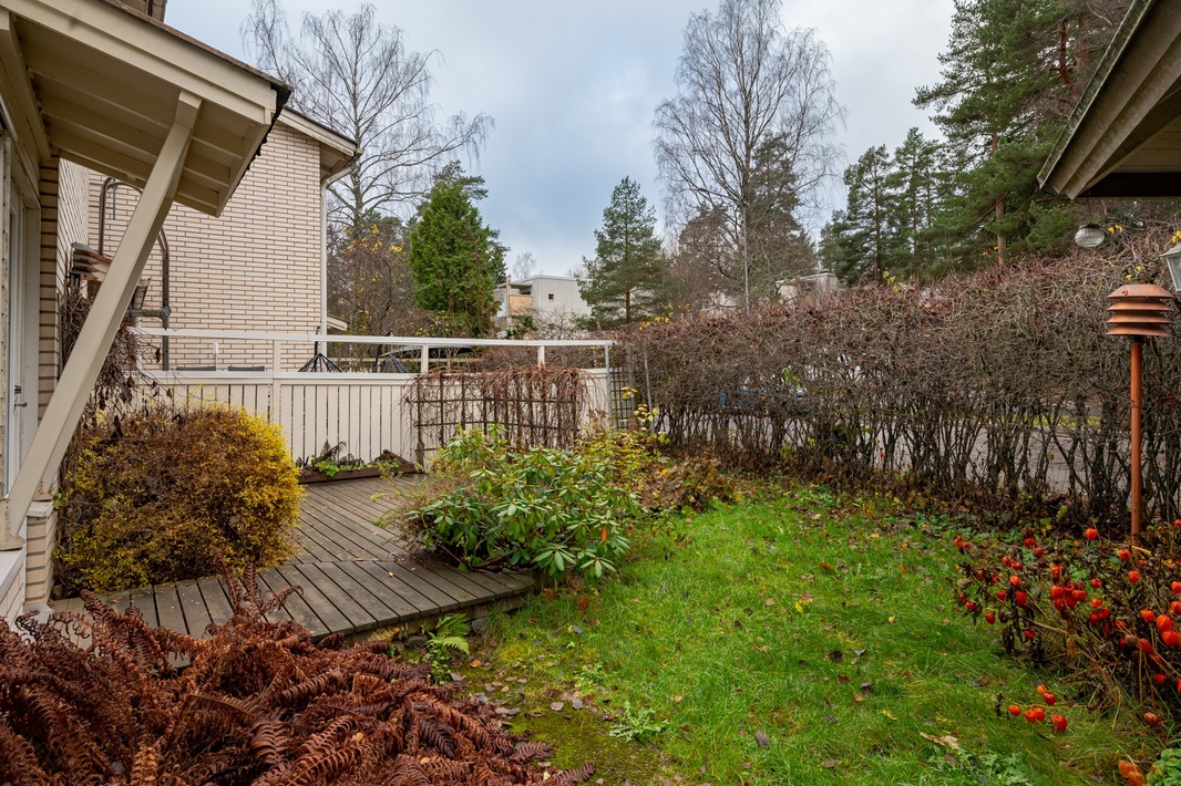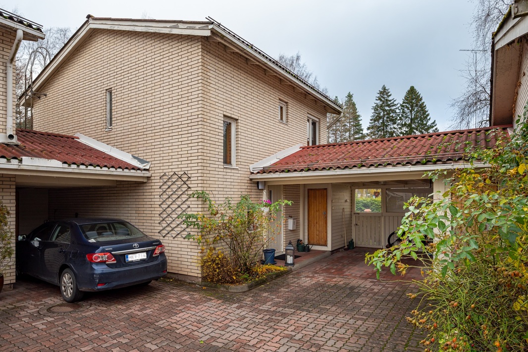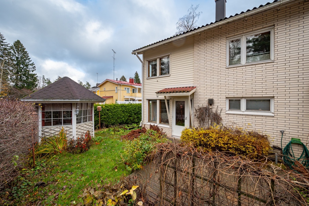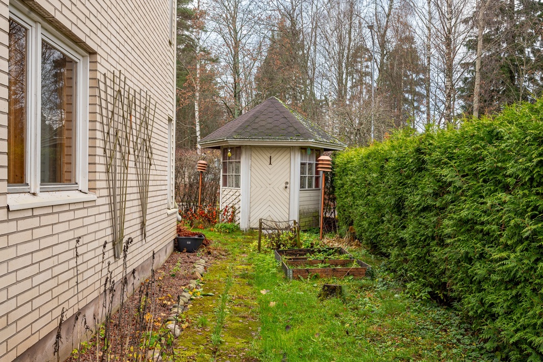 Aurinkoisella takapihalla on monikäyttöinen huvimaja, jossa voi oleskella lähes ympäri vuoden. Asunnolle kuuluu oma autokatospaikka ja ulkovarasto sisäänkäynnin yhteydessä.