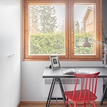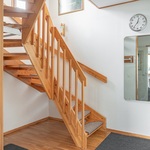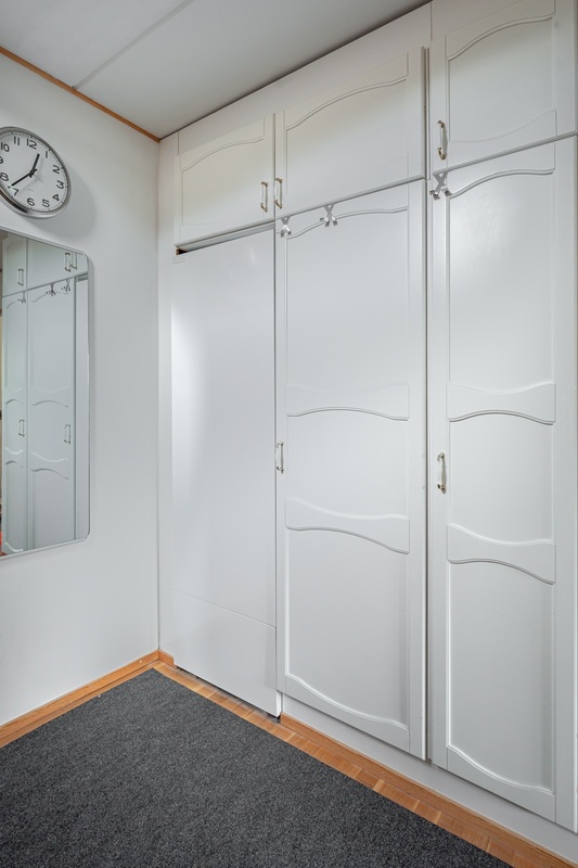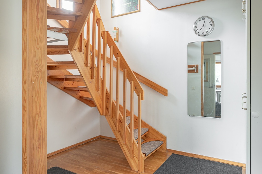 Yläkerrassa tilava ja valoisa olohuone ja keittiö ruokailutiloineen. Yksi makuuhuone löytyy myös täältä. Sen yhteydessä on vaatehuone. Asunto on siistissä kunnossa, mutta kaipaa jo pintojen päivittämistä.