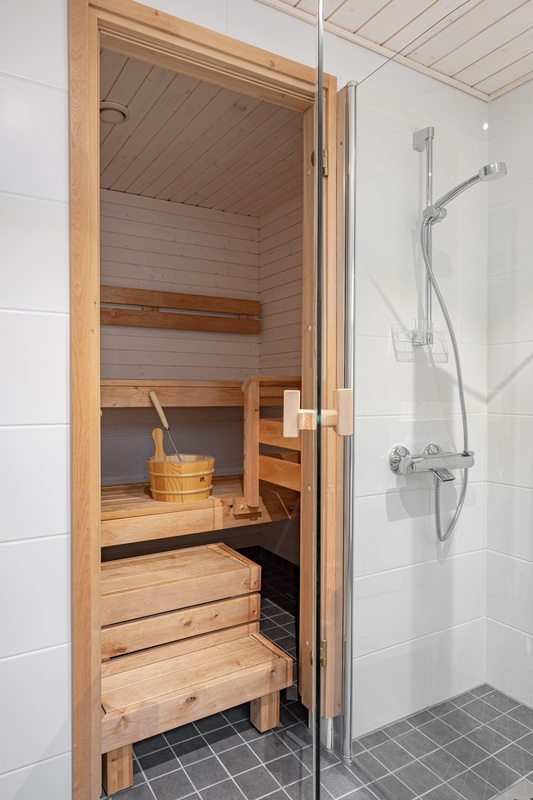 Asunnon kylpyhuone ja sauna ovat juuri valmistuneet remontista.