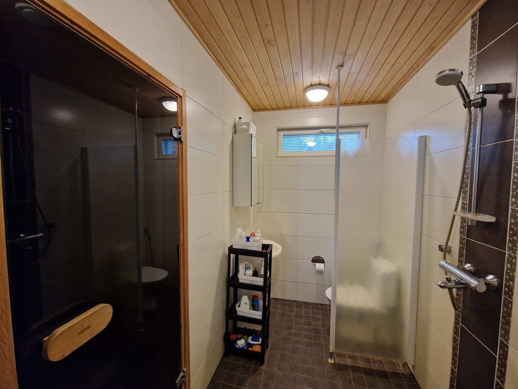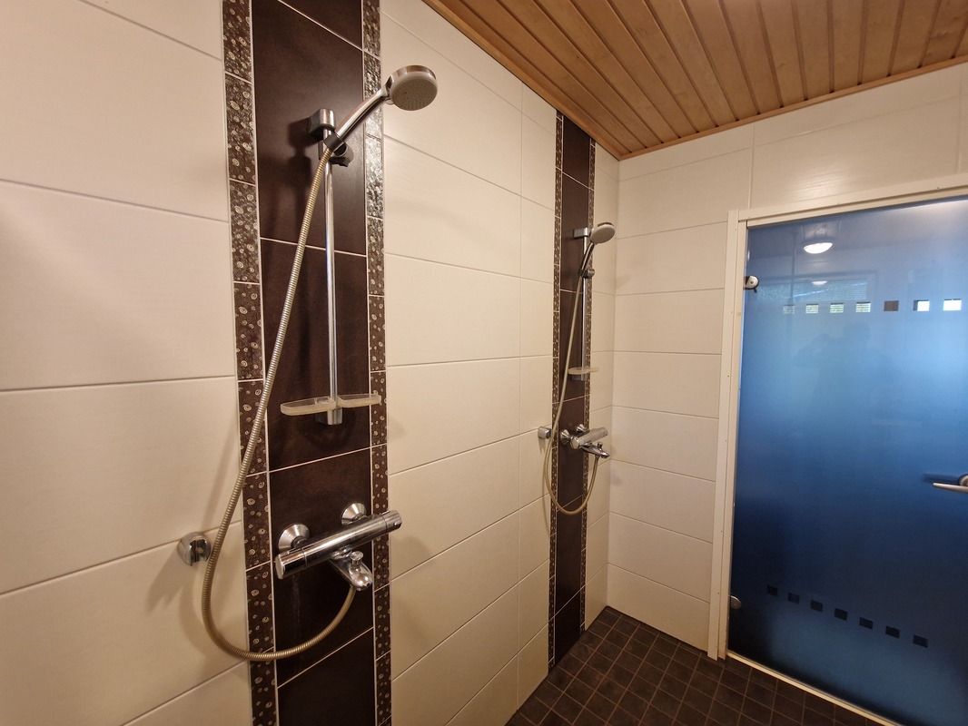 WC-tilojen kuvaus | Saunaosaston kylpyhuoneessa wc, suihkut 2 kpl. Saunassa sähkökiuas. 2 erillistä wc:tä, toisessa myös suihkutilat. Lattialämmitykset molemmissa. |