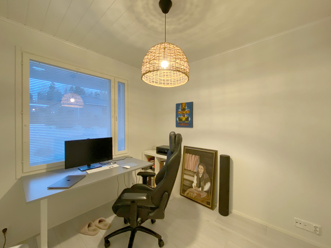 Olohuoneesta käynti aidatulle terassille. Yläkerrassa parveke johon käynti molemmista makuuhuoneista. Asunnon sisäänkäynnin yhteydessä varasto. Asuntoon kuuluu kaksi pistokepaikkaa. Edullinen vaihtoehto uudelle.