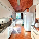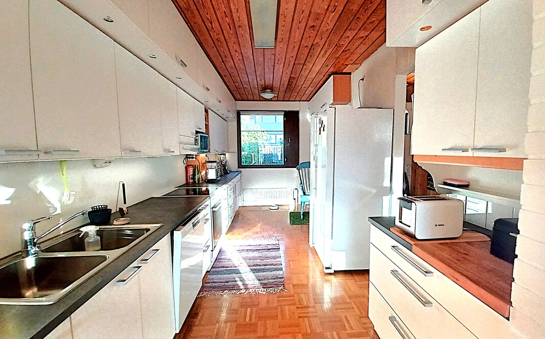 | Keittiön varustelu | Keittiö on osittain remontoitu vuonna 2017. Varustus: jääkaappi/pakastin (side by side -kaappi), astianpesukone, liesituuletin (hormi). Liesi: induktio. Työtasot: laminaatti. Lattia: parketti. Seinät: maalattu. Välitila on laminaattilevyä. |