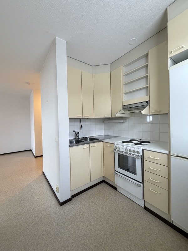 | Keittiön varustelu | Pintamateriaalit ja varusteet: Lattia: Muovimatto // Seinät: Levy/betoni // Katto: Roiskemaali Varusteet: - tiskitaso (2:lla altaalla) - hella (4-lev.)/uuni - liesituuletin - kaapistot - jääkaappi/pakastin - 2 alakaappia + 2 yläkaappia |