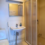 | Kylpyhuoneen kuvaus | Pintamateriaalit ja varusteet: Lattia: Muovimatto // Seinät: Muovitapetti // Katto: Paneeli Varusteet: - peili - bideesuihku - lavuaari - wc-istuin - suihkusermit - suihku - vesimittarit - ppk-liitäntä - kaappi - lattialämmitys (sähkövastus) |