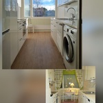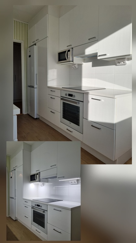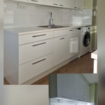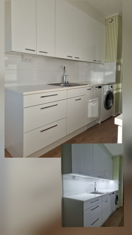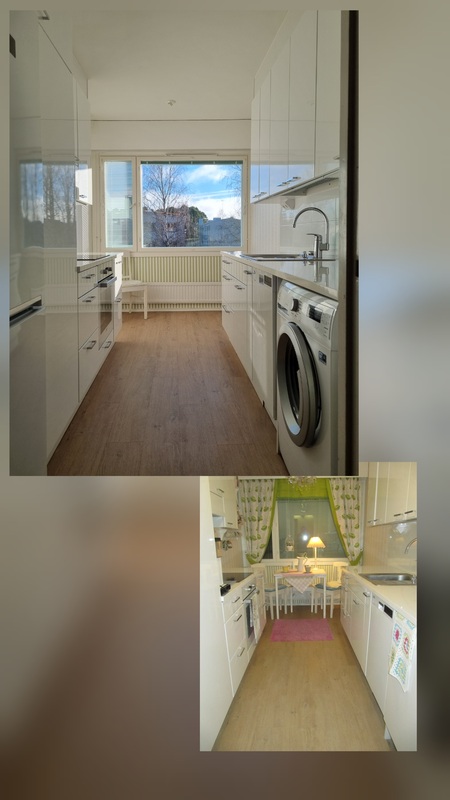 | Keittiön varustelu | - kaapistot, sekä vetolaatikostot - työtasot - tiskitaso (yhdellä altaalla) - keraaminen liesi/kiertoilmauuni - jääkaappi/pakastin - astianpesukone - pyykinpesukone |