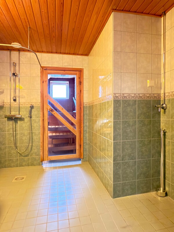 Saunan kuvaus Lattia: Klinkkeri // Seinät: Kaakeli // Katto: Paneeli Varusteet: - sähkökiuas - lauteet - yläikkuna - ei lattiakaivoa