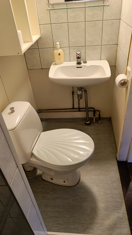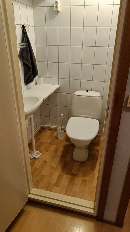 | WC-tilojen kuvaus | HUONEISTO 1. 1. kerros Lattia: Muovimatto // Seinät: Kaakeli // Katto: Petolevy Varusteet: - lavuaari - työtaso - peili - bideesuihku -wc-istuin 2. kerros Lattia: Muovimatto // Seinät: Levy // Katto: Paneeli Varusteet: - peili - työtaso - wc-istuin - kuivausteline HUONEISTO 2. (1. kerros) Lattia: Muovimatto // Seinät: Levy // Katto: Halltex Varusteet: - lavuaari - peili - wc-istuin HUONEISTO 3. (2. kerros) Wc kylpyhuoneessa |