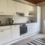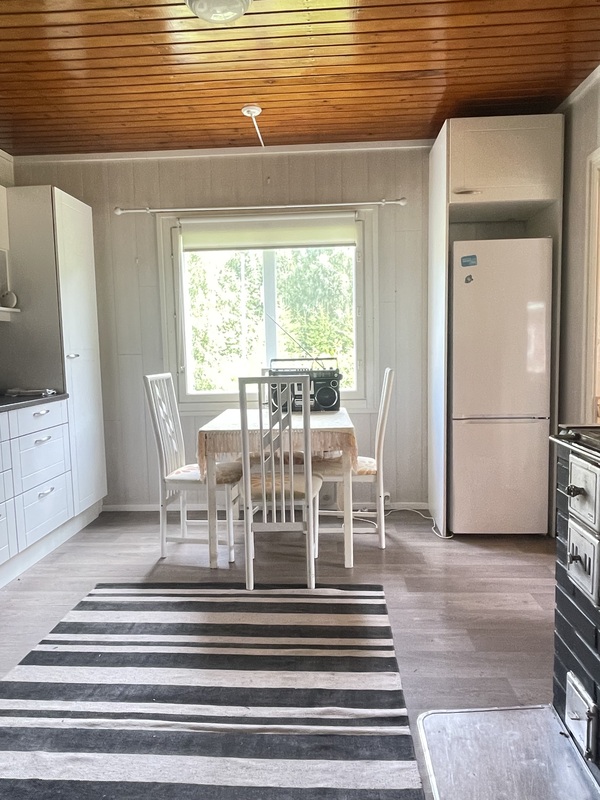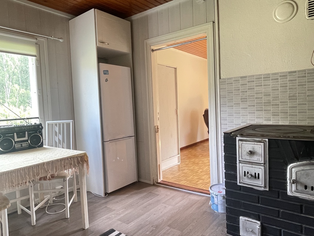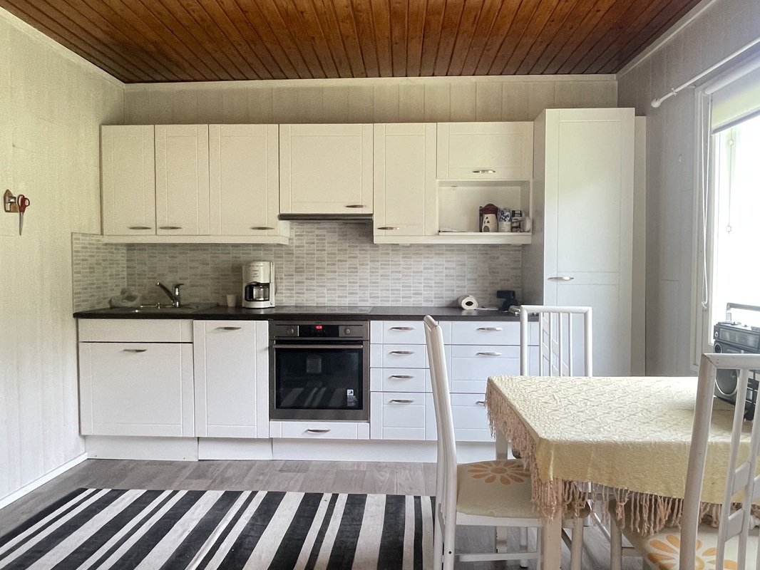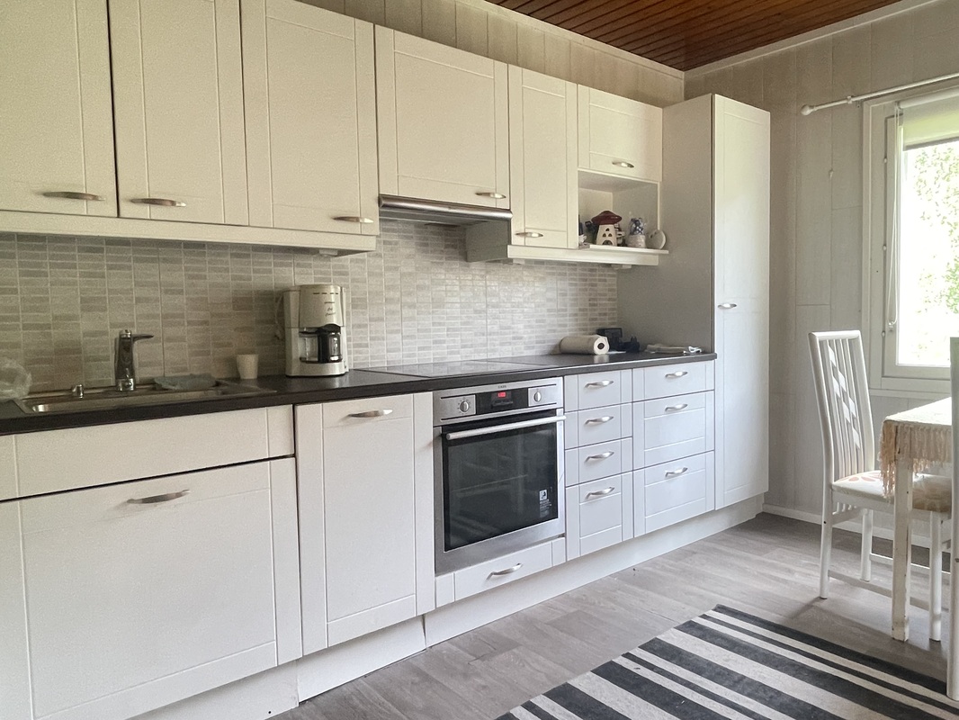 | Keittiön varustelu | Keittiö uusittu 2014. Varusteet: -kaapistot - työtasot - integroitu keittotaso (induktio) / uuni - liesituuletin - jääkaappi/pakastin - puuhella/leivinuuni |