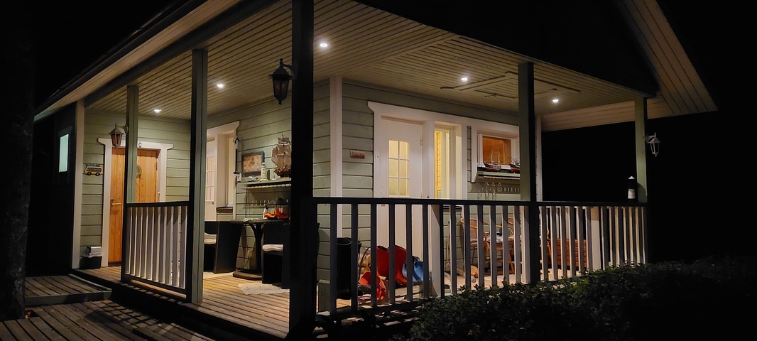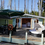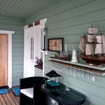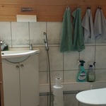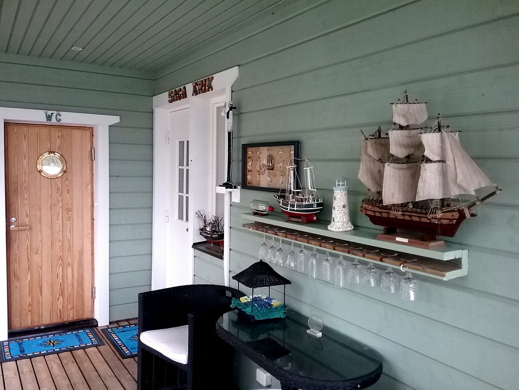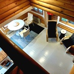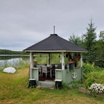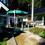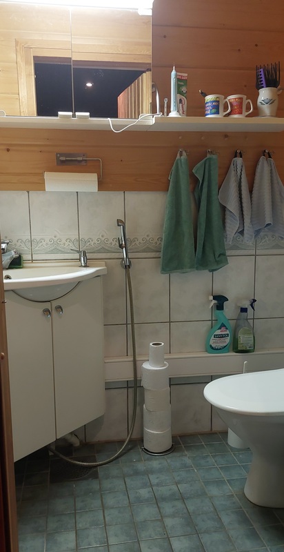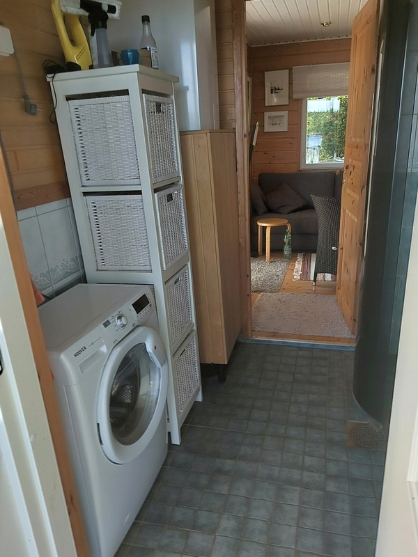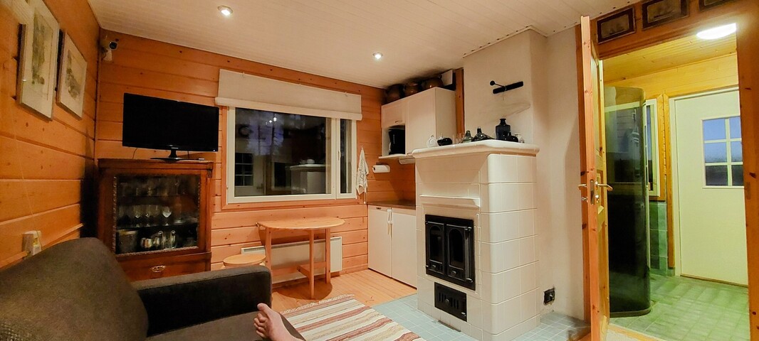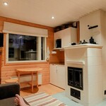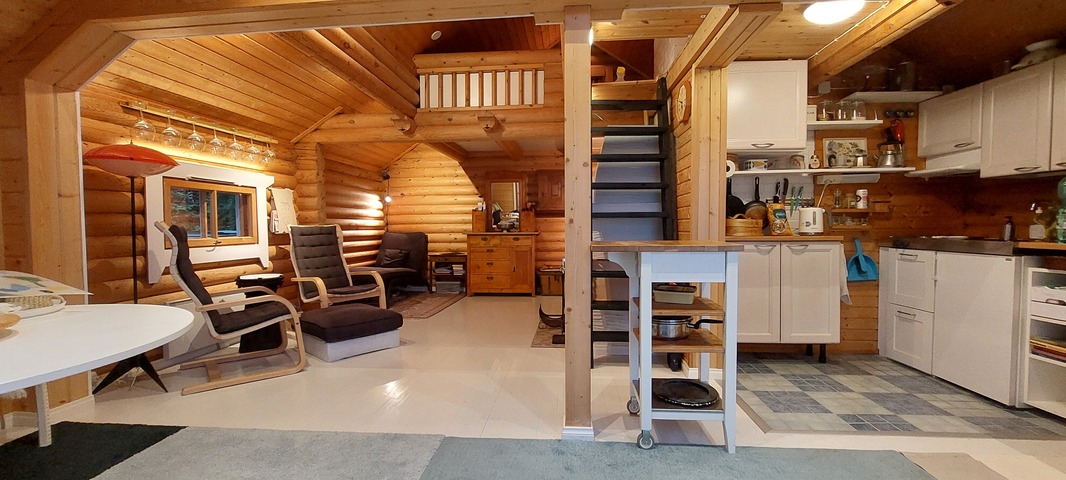 Keittiön varustelu | Lattia: Puu/Klinkkeri // Seinät: Hirsi/Hirsipaneeli (laajennusosa) // Katto:Paneeli Varusteet: - kaapistot - jääkaappi - tiskitaso (1:llä altaalla) - minikeittiö, missä lämminvesivaraaja (20 litraa) - sähköpatteri - |