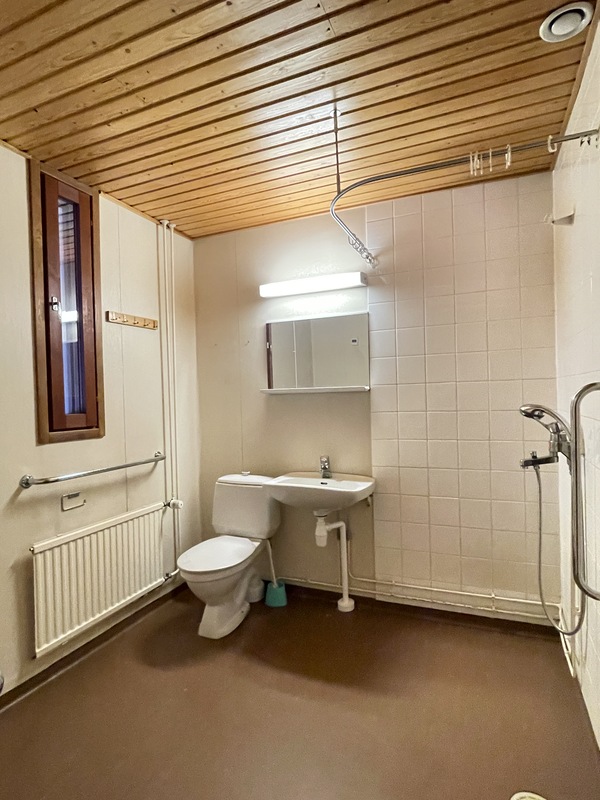| Kylpyhuoneen kuvaus | Lattia: Muovimatto // Seinät: Muovitapetti/Levy // Katto: Paneeli Varusteet: - peili - lavuaari - suihku - vesikiertopatteri - ikkuna (kapea) - wc-istuin |
