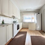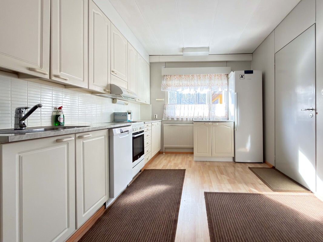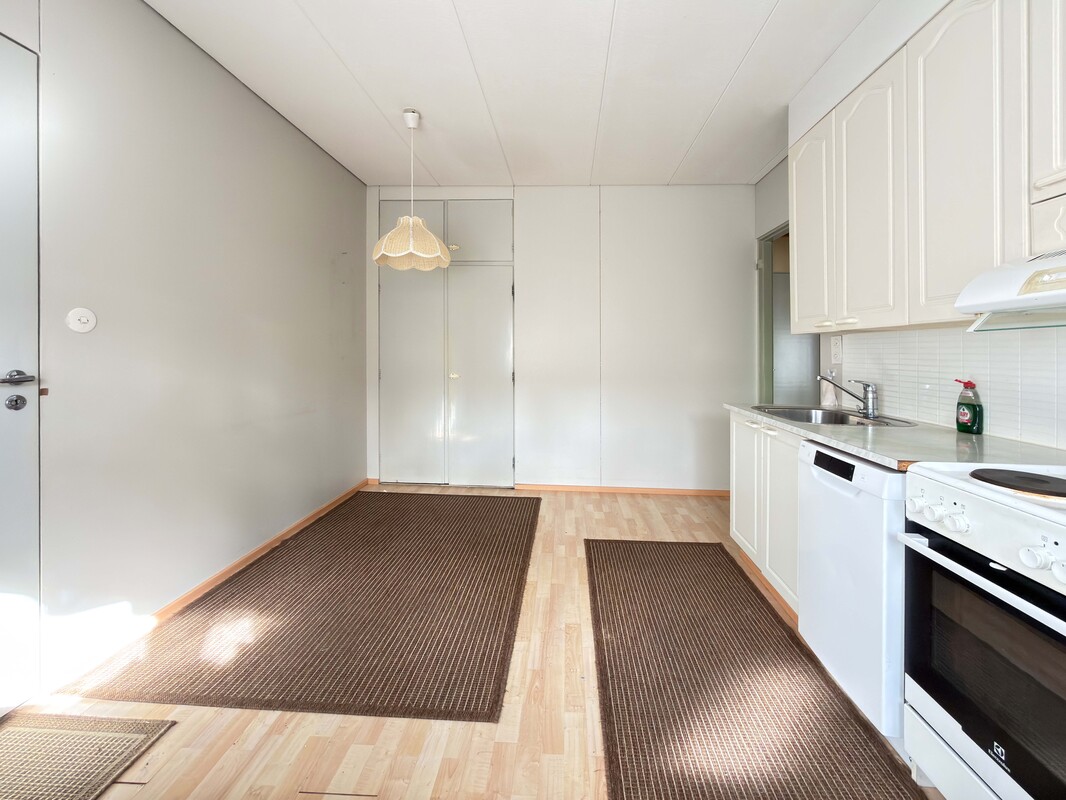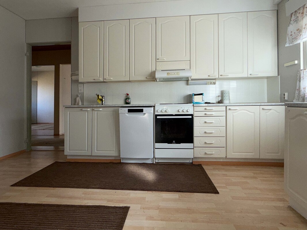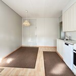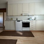 | Keittiön varustelu | Lattia: Laminaatti // Seinät: Levy // Katto: Halltex Varusteet: - kaapistot - työtasot - tiskitaso (1:llä altaalla) - liesi (4-levyinen) / uuni (500mm) - astianpesukone (450 mm) - liesituuletin (500 mm) - jääkaappi |