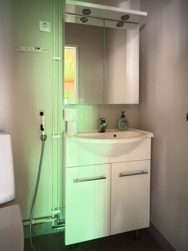 | WC-tilojen kuvaus | Ei kosteusmitattu! Lattia: Klinkkeri // Seinät: Lasikuitutapetti // Katto: Paneeli Varusteet: - peilikaappi - lavuaari - bideesuihku - wc-istuin - vesikiertopatteri |