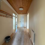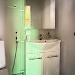 | Kylpyhuoneen kuvaus | PESUHUONE (Huom! kaakelin alla levy) Lattia: Klinkkeri // Seinät: Kaakeli, pystypaneeli // Katto: Paneeli Varusteet: - peilikaappi - yläikkuna - suihku - pyykinpesukone liitäntä |