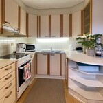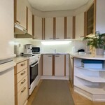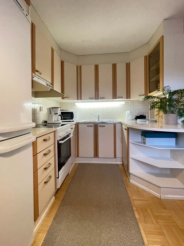 | Keittiön varustelu | Pinnat ja varusteet: Lattia: Parketti // Seinät: Levy // Katto: Levy Varusteet: - kaapistot - jääkaappi/pakastin - keraaminen hella/uuni - liesituuletin - tiskitaso |