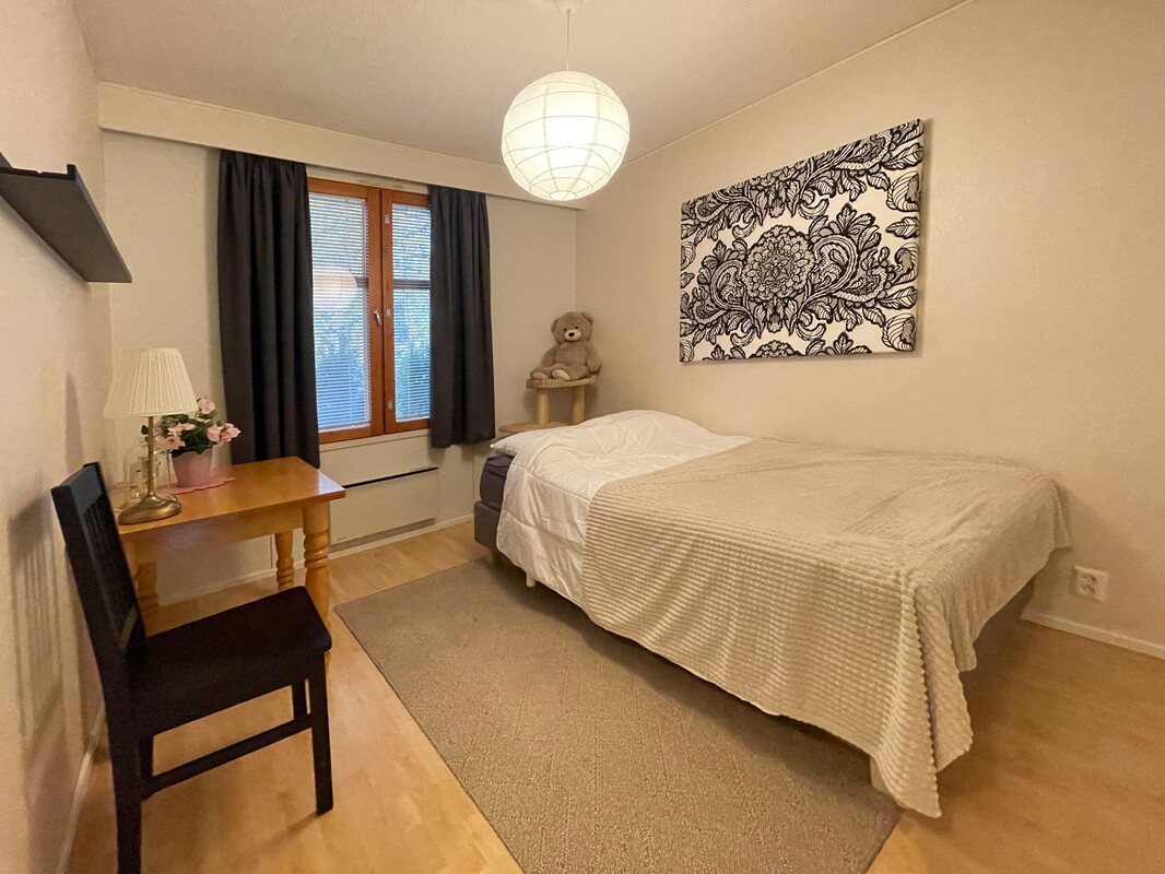 | Makuuhuoneen kuvaus | Pinnat ja varusteet: Lattia: Laminaatti // Seinät: Tapetti // Katto: Levy Varusteet: - sähköpatteri - 4 kaappia |