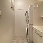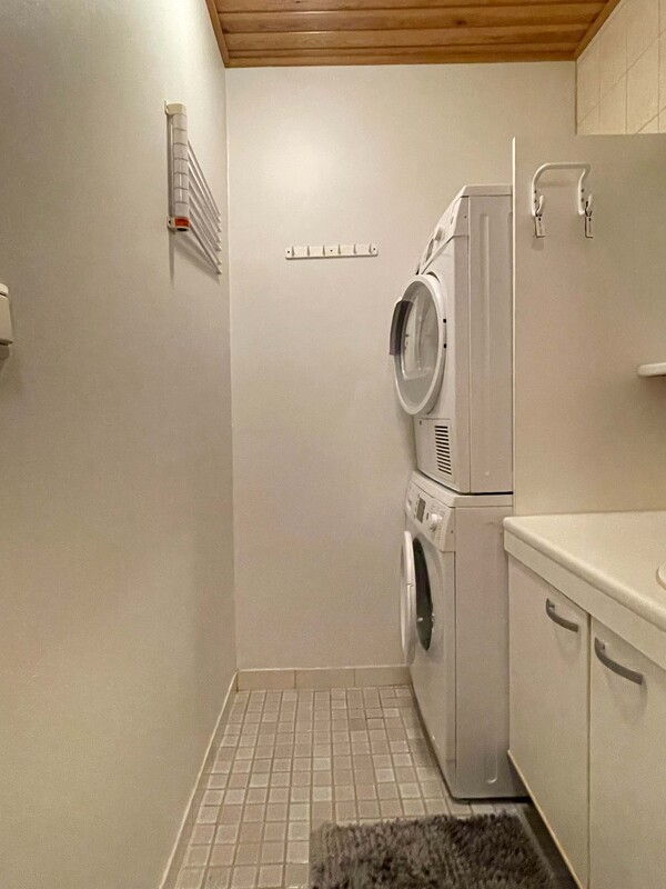 | Kylpyhuoneen kuvaus | Pinnat ja varusteet: Lattia: Klinkkeri // Seinät: Kaakeli/levy // Katto: Paneeli Varusteet: - suihku - bideesuihku - wc-istuin - lattialämmitys - pesukone - kuivausrumpu - lavuaari + taso - allaskaapit - peili |